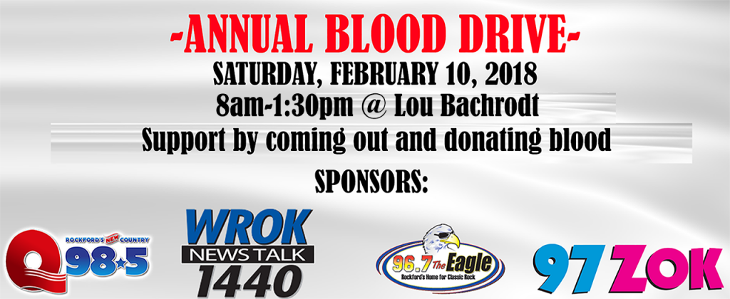 Our annual blood drive is quickly approaching. On Saturday February 10th Lou Bachrodt will be hosting the event from 8am-1:30pm. Over the years, thousands have come out to donate blood to those who have suffered blood loss, or need transfusions of some sort. Come out and help support such a great cause. We encourage everyone in Rockford and neighboring communities to come out and help out, it is greatly appreciated. Thank you those who have helped in the past and those who will be attending this year’s blood drive!